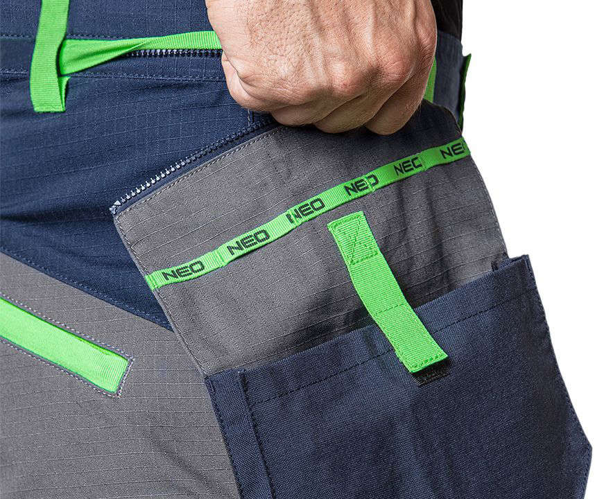 Spodnie robocze PREMIUM, 100% bawełna, ripstop, NEO, wygodne spodnie do wszelkich prac, przeznaczone zarówno do użytku zawodowego, jak i domowego. Zostały wykonane ze wzmocnionej, trwałej tkaniny ripstop. Charakteryzuje się ona specjalną fakturą, która blokuje dalszemu rozdzieraniu ubrania, kiedy zostanie uszkodzone w sposób mechaniczny.