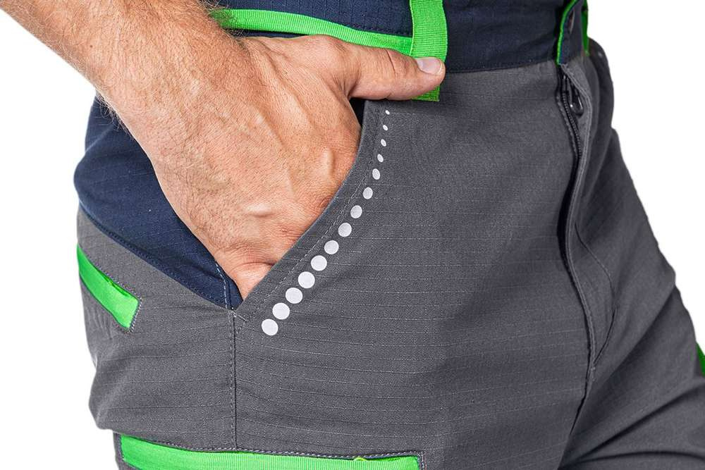 - Odblaskowe nadruki na nogawkach i przy kieszeniach
