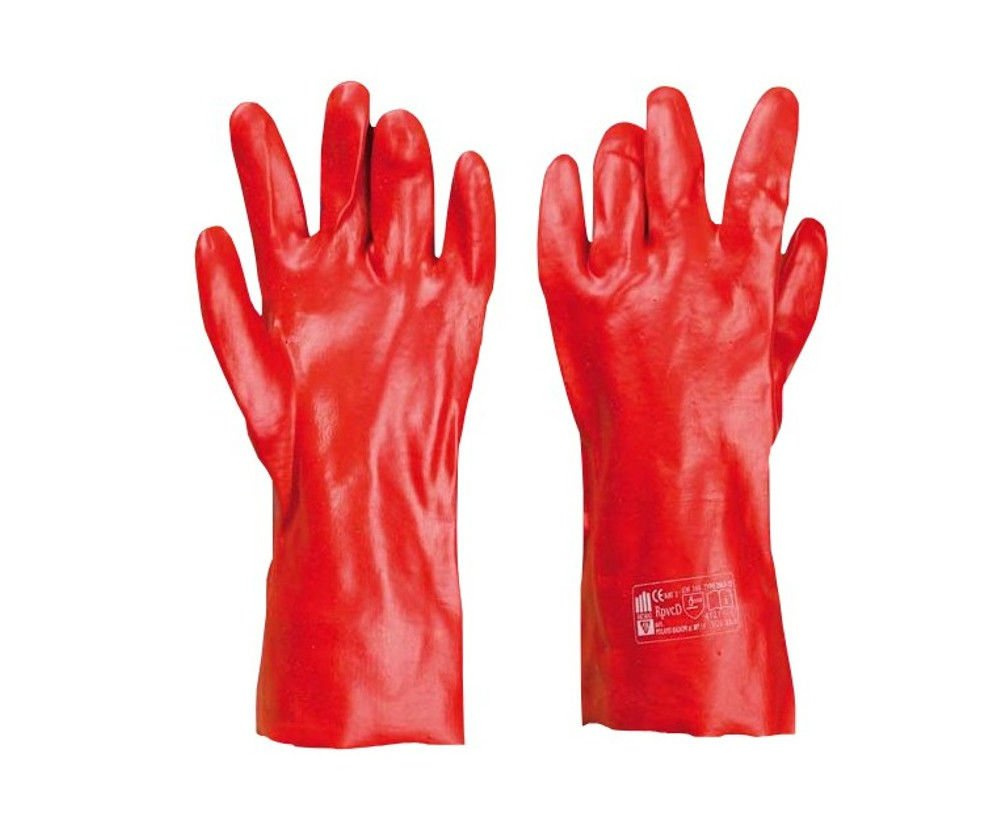 Rękawice ochronne wykonane z PCV, zakończone mankietem.