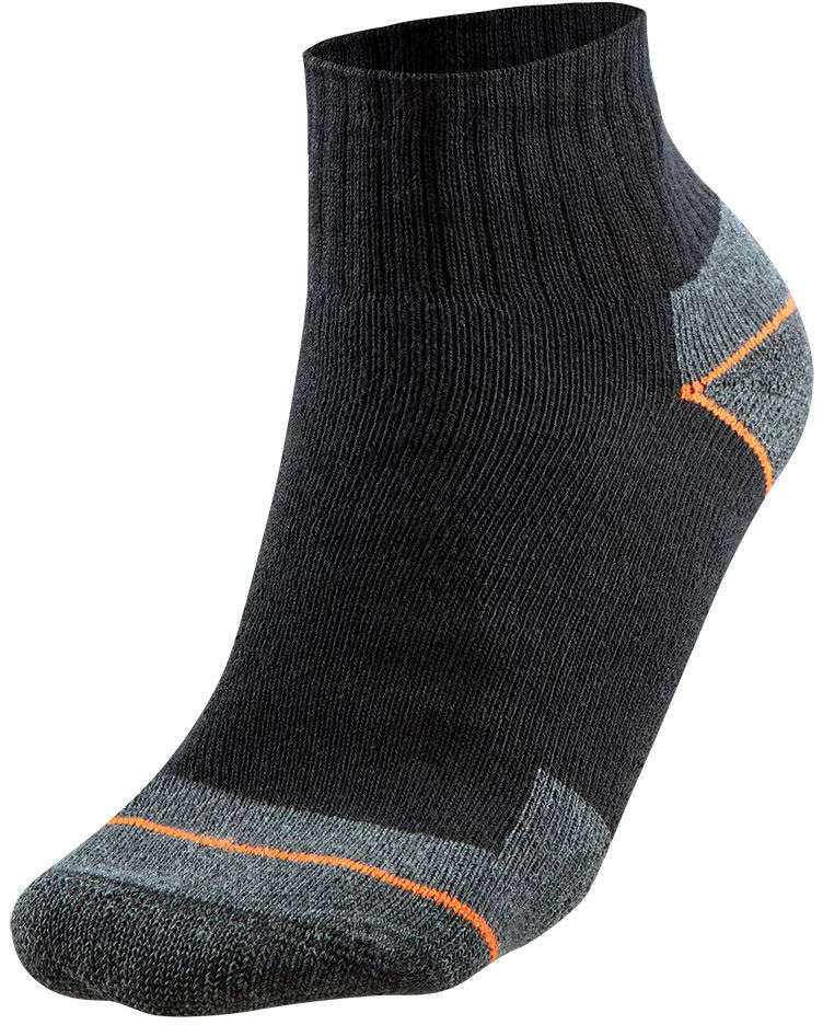 Specjalistyczne skarpety NEO wykonane z wysokiej jakości bawełny z dodatkiem poliestru i elastanu i akrylu, zapewniają komfort i higienę pracy. Na palcach oraz piętach zastosowano wzmocnienia, które chronią przed szybkimi przetarciami. W dyskretnym czarnym kolorze z pomarańczowo-szarymi wstawkami.